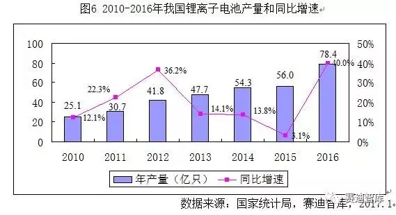 進(jìn)入2016年后,在手機(jī)、電動(dòng)汽車等主要應(yīng)用產(chǎn)品產(chǎn)量快速增長(zhǎng)的帶動(dòng)下,我國(guó)鋰離子電池產(chǎn)量呈現(xiàn)高速增長(zhǎng)態(tài)勢(shì)。國(guó)家統(tǒng)計(jì)局?jǐn)?shù)據(jù)顯示,2016年我國(guó)鋰離子電池累計(jì)產(chǎn)量達(dá)到了78.4億只,同比增長(zhǎng)40%,增速創(chuàng)下2010年以來(lái)的新高。