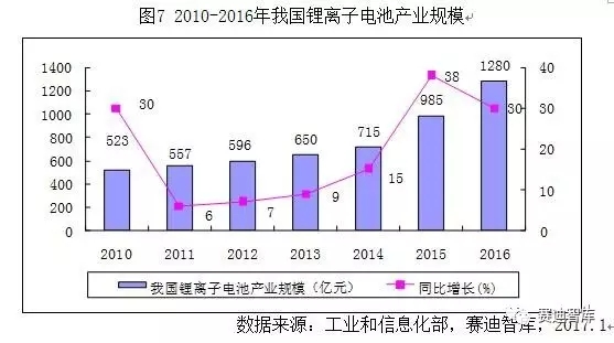 2016年我國(guó)鋰離子電池產(chǎn)業(yè)規(guī)模達(dá)到1280億元,首次突破1000億元大關(guān),同比增長(zhǎng)30%,繼續(xù)保持高速增長(zhǎng)態(tài)勢(shì)。