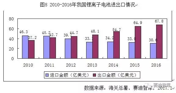 鋰離子電池出口持續(xù)增長(zhǎng),貿(mào)易順差進(jìn)一步擴(kuò)大。據(jù)海關(guān)總署數(shù)據(jù)顯示,2016年我國(guó)鋰離子電池出口14.9億只,出口金額67.8億美元,創(chuàng)歷年來(lái)新高,同比增長(zhǎng)4.5%,增速降至2010年以來(lái)的新低;2016年我國(guó)鋰離子電池進(jìn)口17.0億只,進(jìn)口金額30.6億美元,同比下降7.3%,繼續(xù)保持下滑態(tài)勢(shì)。2016年實(shí)現(xiàn)貿(mào)易順差37.2億美元,比2015年的31.9億美元增長(zhǎng)16.6%。