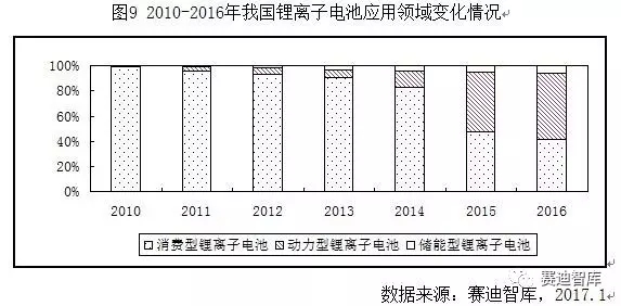 從2015年開始,隨著動(dòng)力型鋰離子電池需求迅猛增長(zhǎng),我國(guó)鋰離子電池產(chǎn)業(yè)結(jié)構(gòu)發(fā)生了顯著變化。按照鋰離子電池產(chǎn)品容量計(jì)算,由于電動(dòng)汽車產(chǎn)量迅猛增長(zhǎng),加上電動(dòng)自行車中鋰離子電池滲透率穩(wěn)步提升,動(dòng)力型鋰離子電池市場(chǎng)需求快速提高,2016年動(dòng)力型鋰離子電池市場(chǎng)占比達(dá)到52%,首次突破50%并超過(guò)消費(fèi)型鋰離子電池,而2015年還只有47%;消費(fèi)型鋰離子電池市場(chǎng)占比繼續(xù)下滑,2016年約為42%,2014年和2015年這一占比還分別為83%和48%;儲(chǔ)能型鋰離子電池在光伏分布式應(yīng)用以及移動(dòng)通信基站儲(chǔ)能電池領(lǐng)域的應(yīng)用不斷擴(kuò)大,2016年達(dá)到6%,比起2014年的4%、2015年的5%,一年上一個(gè)臺(tái)階。