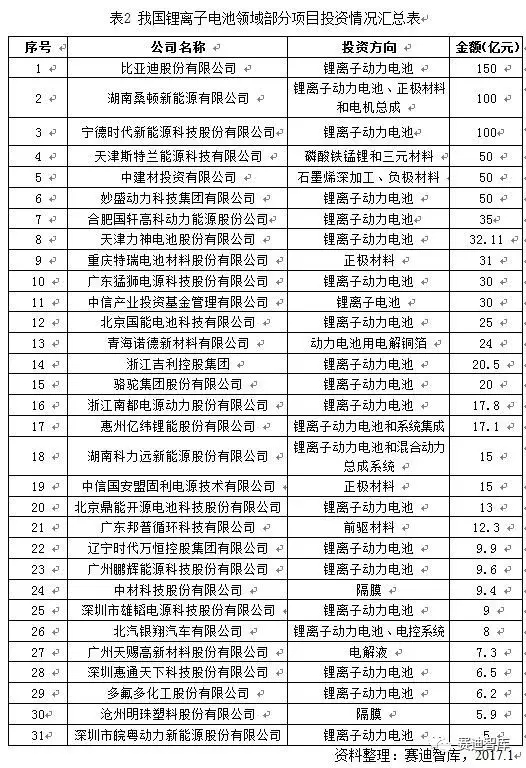 2015年開始我國(guó)電動(dòng)汽車呈現(xiàn)井噴式增長(zhǎng)勢(shì)頭,帶動(dòng)了鋰離子動(dòng)力電池市場(chǎng)需求猛增,2016年這一局面繼續(xù)持續(xù),加上“十三五”期間我國(guó)大力發(fā)展電動(dòng)汽車的戰(zhàn)略決策,鋰離子電池產(chǎn)業(yè)投資力度在2016年不減,從上游關(guān)鍵原材料到下游電芯、模組,骨干企業(yè)加快擴(kuò)產(chǎn)步伐,以期在動(dòng)力電池領(lǐng)域搶占有利市場(chǎng)地位。據(jù)不完全統(tǒng)計(jì),2016年國(guó)內(nèi)鋰電產(chǎn)業(yè)投資(含擬投資)超過(guò)1200億元,實(shí)際投資550億元,其中動(dòng)力電池、正極材料、隔膜投資額最多,表2所示為部分投資項(xiàng)目情況匯總表。其中,比亞迪、寧德新能源、國(guó)軒高科、天津力神等國(guó)內(nèi)動(dòng)力電池領(lǐng)軍企業(yè)投資額均在30億元以上。
