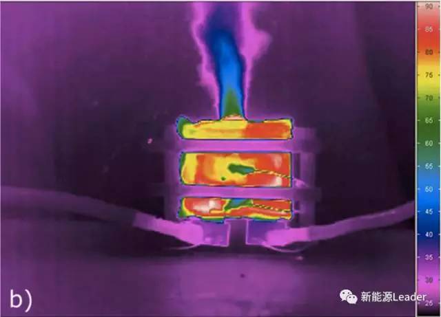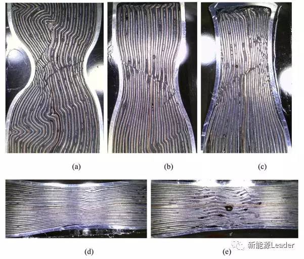 在擠壓測(cè)試中,隨著電池變形程度的增加,正負(fù)極集流體會(huì)首先被撕裂,并沿著45度失效線發(fā)生滑移,活性物質(zhì)也會(huì)進(jìn)入到45度失效線內(nèi),隨著隔膜變形程度的不斷增加,隔膜最終達(dá)到失效點(diǎn),引起正負(fù)極短路的發(fā)生【2】,擠壓造成的正負(fù)極短路主要是以點(diǎn)狀短路為主【3】,因此會(huì)在短路點(diǎn)產(chǎn)生非常大的電流,熱量集中釋放,引起短路點(diǎn)的溫度急劇上升,因此很容易引發(fā)熱失控。