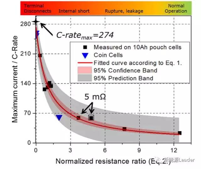 Akos Kriston的研究發(fā)現(xiàn),影響短路測(cè)試結(jié)果的主要因素是短路電阻阻值和鋰離子電池的內(nèi)阻的比例,這甚至要比鋰離子電池內(nèi)阻和電池的荷電狀態(tài)對(duì)實(shí)驗(yàn)結(jié)果的影響還要大??梢钥吹剑搪冯娮璧淖柚蹬c鋰離子電池越接近,鋰離子電池就越容易發(fā)生熱失控,只有當(dāng)短路電阻的阻值是鋰離子電池內(nèi)阻的9-12倍以上時(shí),鋰離子電池才能通過(guò)短路安全測(cè)試。其實(shí)這也不難理解,在短路放電的過(guò)程中,熱量主要由外電路的短路電阻和電池內(nèi)阻產(chǎn)生,根據(jù)焦耳熱的公式P=I2R,在電流相同的情況下,發(fā)熱功率與電阻程正比,在電池能量一定的情況下,阻值大的部分自然也就會(huì)產(chǎn)生更多的熱量。