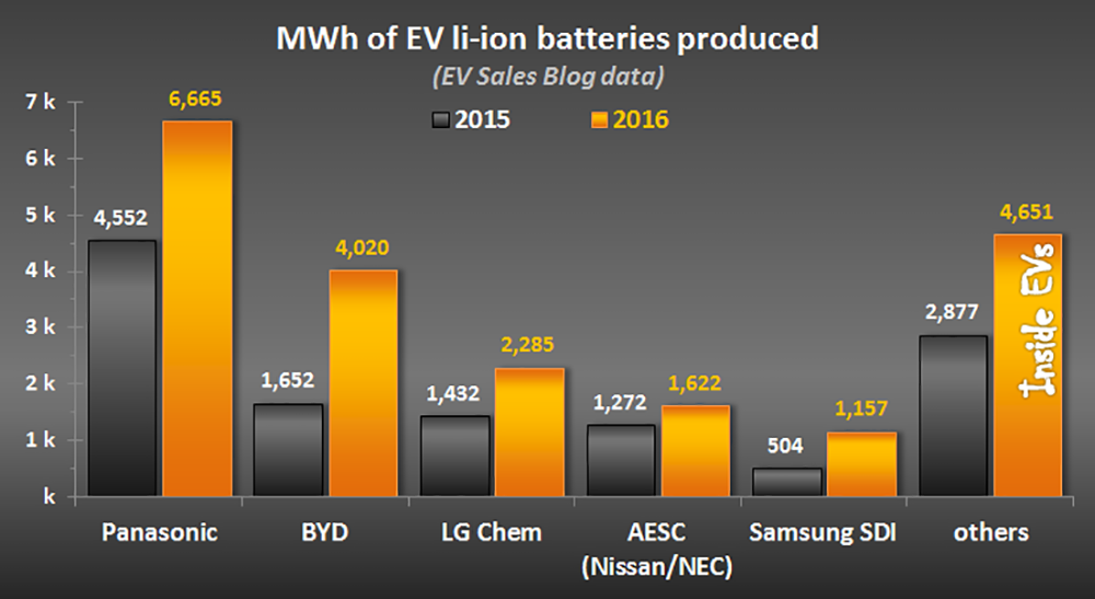 中國國產(chǎn)動力電池市場份額最高的比亞迪,預計今年年底磷酸鐵鋰、三元鋰電池產(chǎn)能可以達到 16GWh,公司還在青海建設新的電池工廠,預計建成后年產(chǎn)能可達 10GWh。2015 年,路透社有報道稱比亞迪計劃在 2020 年將動力電池產(chǎn)能提高至 34GWh,相當于在中國市場上再造一個特斯拉 Gigafactory。市場份額僅次于比亞迪的寧德時代,更是透露要在 2020 年達到 50GWh 的年產(chǎn)能,盡管后者 2016 年年產(chǎn)能只有 6.8GWh。
