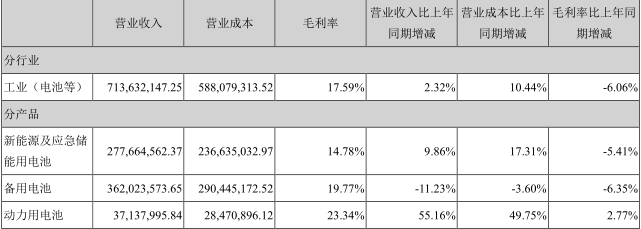 動力用電池營業(yè)收入和營業(yè)成本分別同比增長55.16%、49.75%,主要是公司積極拓展低速電動車、電動叉車等市場領(lǐng)域,銷售量同比增長所致。其他業(yè)務(wù)營業(yè)收入和營業(yè)成本分別同比增長183.56%、210.93%,主要是系統(tǒng)集成項目等非電池銷售新增所致。