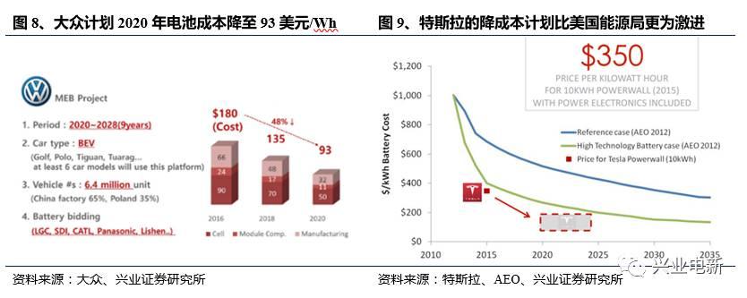 產(chǎn)業(yè)界龍頭目標更為激進,特斯拉、通用與大眾紛紛宣布降成本計劃,2020年目標最低低至93美元/KWH。