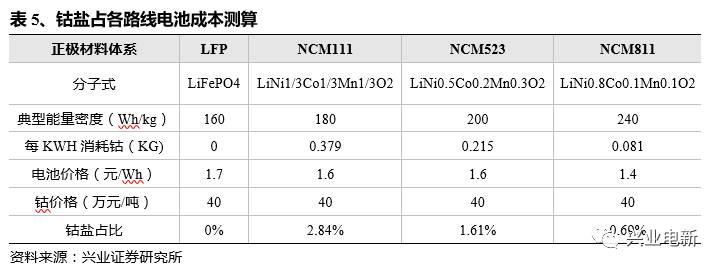 預計鈷價上漲對三元電池影響有限。雖然目前高鎳三元材料市場份額逐步提高,但絕大部分廠商已進入從532向622轉(zhuǎn)移的階段,未來過渡到811后,單位用鈷量將明顯減少。根據(jù)前述測算,高鎳NCM811路線中鈷鹽占售價比不到1%,因此未來高鎳三元時代到來后,鈷價上漲將不會對降成本起到太大影響。
