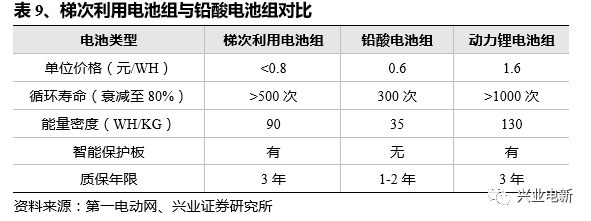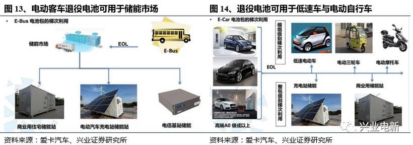 1)儲能市場:據(jù)測算,儲能電池市場化應用的目標成本為180美元/kwh,約合1.2元/wh,使用新型動力鋰電池無法達到成本要求,投資回報率偏低,這也是制約儲能產(chǎn)品大規(guī)模應用的最大障礙。梯次利用的動力電池能夠較好地權衡成本與性能因素,如電動大巴退役的動力電池由于能量密度較低,比較適合作為儲能基站使用。
