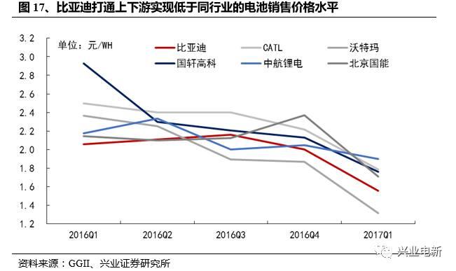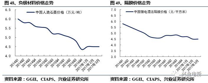 5、隔膜:高毛利率疊加工藝改進,存降價空間。隔膜種類較多,從高端到低端價格差異很大,但17年普遍存在降價空間。從全球隔膜龍頭星源材質(zhì)的情況看,16年干法隔膜均價為4.2元/平米,今年降至3.7-3.8元/平米,濕法去年5元/平米,今年4.5元/平米,能夠鎖定較長時間。星源16年隔膜毛利率在60%,這塊壓價空間很大。且隔膜龍頭本身也存在通過技術改進進一步降成本的能力與訴求。結(jié)合星源調(diào)價與上述因素來看,判斷隔膜17年價格下降幅度在10%左右。