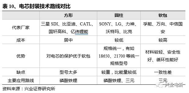 電芯封裝方式按軟包、方形與圓柱分,成本也有所區(qū)別。其中,圓柱最低,軟包最高。主流大廠中CATL與比亞迪走方形路線,力神、比克走圓柱路線,國軒高科同時走方形與圓柱路線,同時CATL也在積極拓展軟包路線。