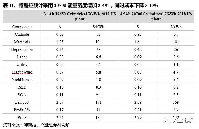 降成本方向:做大單體電芯。特斯拉已經(jīng)Model3中用20700替代18650電芯,20700電池增加的尺寸大概為10%,而體積和能量儲存確是18650的1.33倍。根據(jù)特斯拉的估計,在達到與18650同樣的良率和產(chǎn)能后,20700能帶來能量密度增加3-4%,同時實現(xiàn)成本下降5-10%。