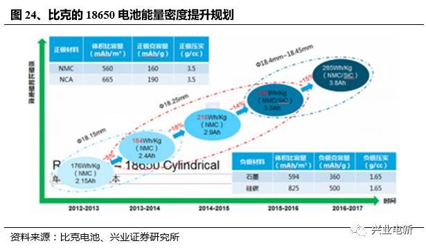 本土三元龍頭企業(yè)正在加速實現(xiàn)高比能三元電池量產(chǎn)。以本土高比能電池的代表企業(yè)比克電池為例,其16年三元出貨量0.9GWh,在本土企業(yè)中位列第2,僅次于CATL,其商業(yè)規(guī)劃具備一定代表性。根據(jù)其規(guī)劃,比克的NCM與NCA電池量產(chǎn)計劃齊頭并進,目前能量密度達248WH/KG的NCA電池已實現(xiàn)量產(chǎn),而下一代285WH/KG的NCA電池將于年內(nèi)量產(chǎn)。就能量密度來看,已經(jīng)達到特斯拉與松下水準。