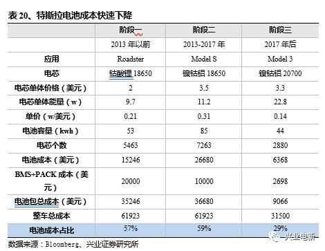階段3:為超級電池工廠建成之后(2017~):電池成本下降30%以上。預計21700單體價格為$3.3,折合0.14美元/w。由于Model3電芯數(shù)量較少且容量較少,預計Model3BMS+PACK成本為$2880左右,綜合電池包成本為$6960,電池包成本占比29%。