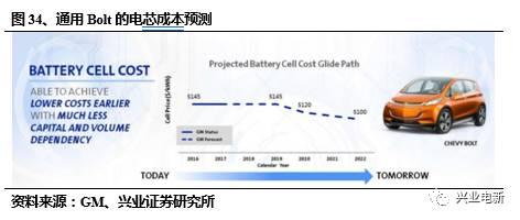 通用汽車在2015年曾經(jīng)披露過Bolt電動車采用LGChem的電池,電芯cell的價格為145美元/kWh左右。在年度全球商業(yè)會議上,通用汽車進一步對外展示了Bolt的電池電芯cell的成本預測。其中2016年的成本為145美元/kWh,這個數(shù)值持續(xù)到2019年,2020年會下降到120美元/kWh。到2022年,該數(shù)值繼續(xù)下降到100美元/kWh。合理推算得到通用bolt電池組成本在200美元/kWh,到2020年降至170美元/kWh。