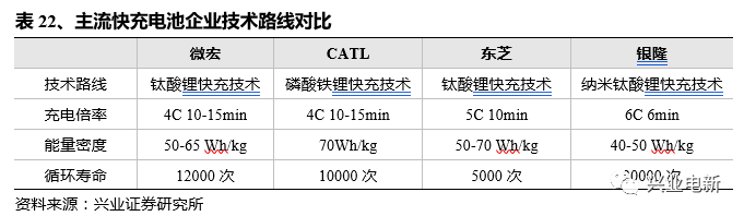 快充電池已實現(xiàn)成熟的商業(yè)化應用。目前快充類電動車已超過15000臺,累計運行超過10億公里,在公交車等對于充電時間要求較為嚴格的領域應用較為廣泛??斐渲髁骷夹g路線有兩類,一類是以鈦酸鋰替代石墨作為負極材料,代表企業(yè)有微宏、銀隆等,另一類是在磷酸鐵鋰體系下采用快充型石墨作為負極,代表企業(yè)為CATL。