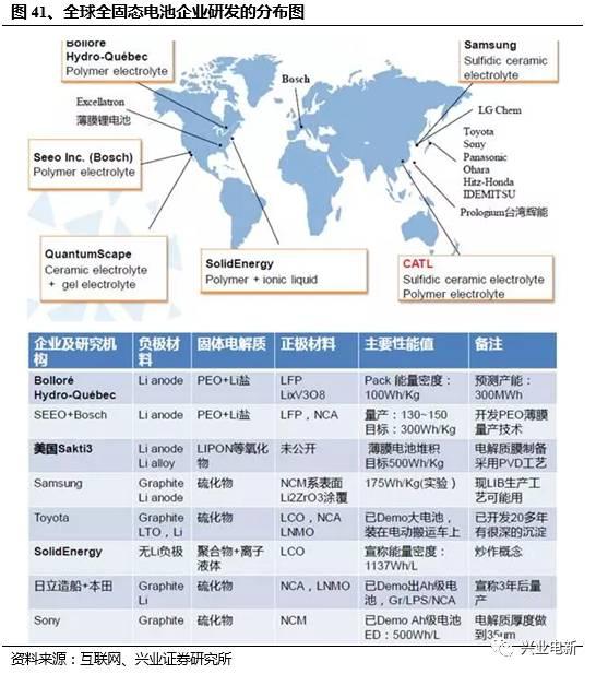 固態(tài)電池:高比能量+不燃燒。工作原理上固態(tài)鋰電池和傳統(tǒng)的鋰電池并無區(qū)別,只是電解質(zhì)從液態(tài)變?yōu)楣虘B(tài)。固態(tài)電池的優(yōu)勢在于:1)能量密度:固態(tài)電池不再使用石墨負極,而是直接使用金屬鋰負極,大大減輕負極材料的用量,使得整個電池的能量密度有明顯提高。目前實驗室已經(jīng)可以小規(guī)模批量試制出能量密度為300-400Wh/kg的全固態(tài)電池。2)安全性:固態(tài)電池不會在高溫下發(fā)生副反應,不會因產(chǎn)生氣體而發(fā)生燃燒。目前豐田、松下、三星、三菱以及國內(nèi)的寧德時代等電池行業(yè)領軍企業(yè)都已經(jīng)積極布局固態(tài)電池的儲備研發(fā)。