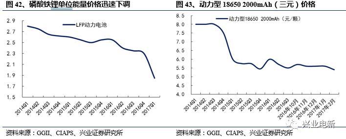1)2016年磷酸鐵鋰電池價格2.3元/WH,17年下降20%,三元電池價格2.1元/WH,價格下降20%,三元由于能量密度提升,綜合成本降幅設定為10%。