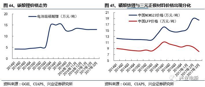 3、正極材料:LFP材料存在降價空間,NCA與NCM材料降價空間不大。正極材料價格與兩塊相關,一塊是主要的原料電池級碳酸鋰,另一塊是前驅(qū)體,磷酸鐵鋰與鐵礦石相關、三元路線則與鎳、猛、鈷等有色金屬價格相關。電池級碳酸鋰價格從16年年底開始保持平穩(wěn),在13萬元/噸的水平。從龍頭天齊鋰業(yè)與贛鋒鋰業(yè)最新披露的情況來看,17年市場需求穩(wěn)定增長20%左右,中高端級別需求更大,考慮到上游仍較高的毛利率水平(天齊毛利率60%、贛鋒35%)與下游強烈的壓價意愿,電池級碳酸鋰價格可能緩緩回落至10萬/噸的水平。