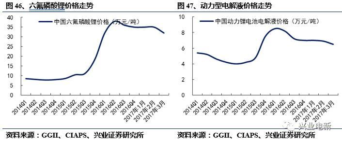 動力電池電解液價格走勢與六氟磷酸鋰基本一致,由去年3季度高點8.5萬元/噸降至目前6.9萬元/噸。目前電解液龍頭的毛利率在30%左右(新宙邦)也存在壓價空間。隨著六氟磷酸鋰降價與下游對于電解液企業(yè)的壓價,預計電解液17年降價幅度將達到20%。