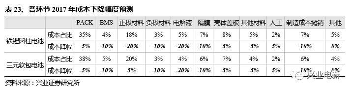 7、其他材料:整體降價空間不大。殼體蓋板由于鋼價與鋁價的上漲,17年價格可能上漲,判斷在5%左右。制造成本攤銷這一塊與產(chǎn)線自動化水平與產(chǎn)能利用率相關,隨著規(guī)模擴張帶來單位成本下降與產(chǎn)能利用率維持在平均水平以上,制造成本攤銷有望下降10%。勞動力成本按照工資上漲5%計。其他材料包括正極方面用的粘結(jié)劑PVDF、溶劑NMP、集電體鋁箔,負極方面用的粘結(jié)劑CMC、溶劑去離子水、集電體銅箔,用于極耳的鋁帶、鎳帶等等,預計降幅有限,在5%左右。其他成本包括環(huán)保成本,判斷這塊難以下降。整體來看,除四大材料之外的其他成本降幅在3%-5%之間。