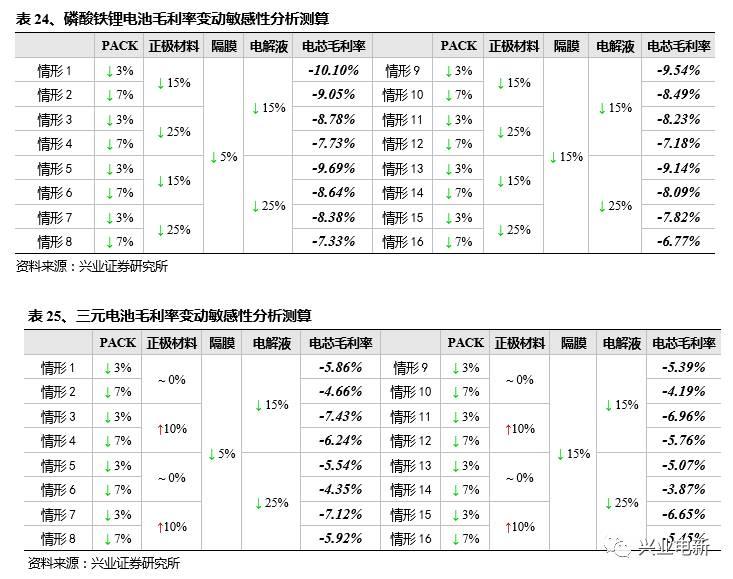 根據(jù)上文擬定的各環(huán)節(jié)成本下降中樞,對于PACK、正極材料、電解液與隔膜等變化可能性較大,同時對于動力電池盈利能力潛在影響較大的環(huán)節(jié)進行展開模擬測算,給予下述假定,得到磷酸鐵鋰動力電池業(yè)務毛利率受影響的幅度在7%-10%之間,三元動力電池受影響的幅度在4%-7%。