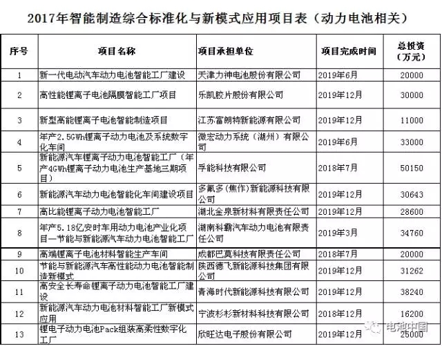 中國儲能網(wǎng)訊:近期,工信部發(fā)布《關(guān)于組織實(shí)施2017年智能制造綜合標(biāo)準(zhǔn)化與新模式應(yīng)用項(xiàng)目的通知》,確定了2017年智能制造綜合標(biāo)準(zhǔn)化與新模式應(yīng)用項(xiàng)目。其中涉及了13項(xiàng)與動力電池相關(guān)項(xiàng)目。這些項(xiàng)目分布預(yù)計到2018、2019年完成建設(shè)。