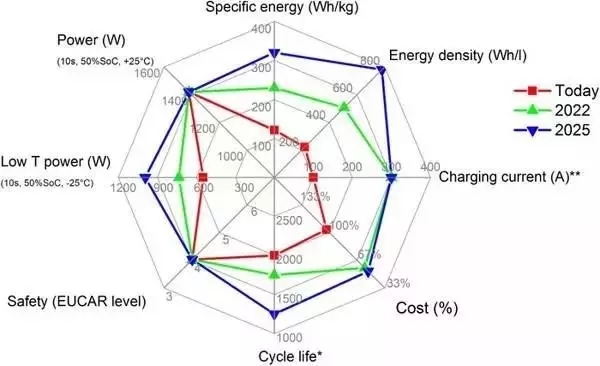 目前商用動(dòng)力電池的技術(shù)水平和未來(lái)10年預(yù)期可達(dá)到的目標(biāo)見(jiàn)圖1,而實(shí)際產(chǎn)品生產(chǎn)中往往這些指標(biāo)又是互相矛盾的,電池相關(guān)性能需要權(quán)衡考慮。電池性能的提高需兼顧電極材料、電解液、隔膜的性能,同時(shí)裝配技術(shù)、電池系統(tǒng)成組、管理技術(shù)的跟進(jìn)也至關(guān)重要。