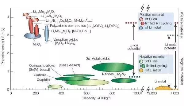 鋰電正負(fù)極材料體系非常豐富(圖2),目前,鈷酸鋰、錳酸鋰、磷酸鐵鋰、鎳鈷錳鋰等正極材料研究已趨于成熟。鈷酸鋰材料比容量有200-210 mA·h/g,其材料真密度和極片壓實(shí)密度均是現(xiàn)有正極材料中最高的,商用鈷酸鋰/石墨體系的充電電壓可提升4.40 V,已經(jīng)可滿足智能手機(jī)和平板電腦對(duì)高體積能量密度軟包電池的需求。