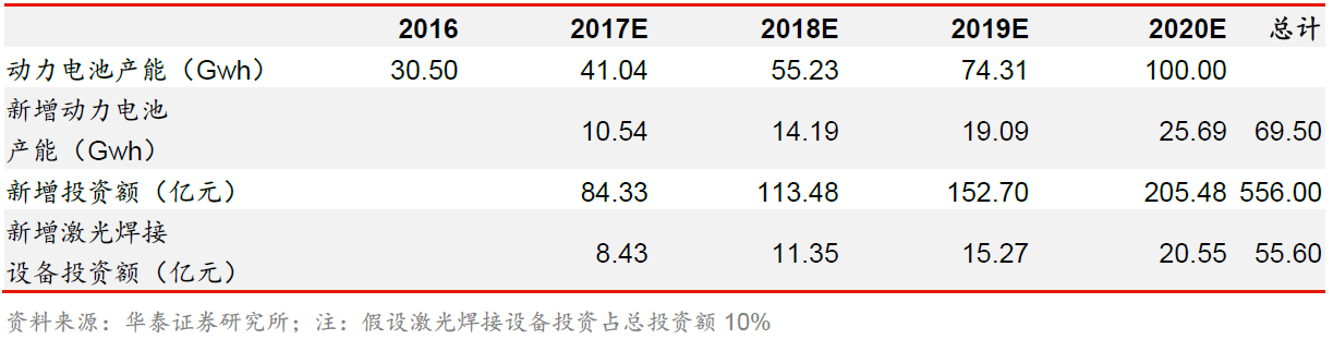 十三五規(guī)劃期間顯示動力電池投資額將達到560億元,對應(yīng)激光設(shè)備需求56億元。假設(shè)國家將在2020年達到《促進汽車動力電池產(chǎn)業(yè)發(fā)展行動方案》中目標(biāo),那么在2017年到2020年間,國內(nèi)動力電池新增產(chǎn)能約為70Gwh。根據(jù)部分動力電池項目的投資情況不完全統(tǒng)計,每Gwh新增產(chǎn)能對應(yīng)的投資額約為8億元,而激光焊接設(shè)備在動力電池廠投入中占比5至15%,則到2020 年國內(nèi)動力電池廠新增設(shè)備需求約為28至84 億元。