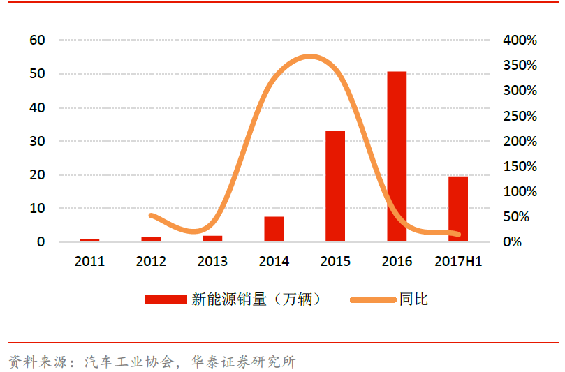 新能源汽車需求持續(xù)增長,推動動力電池行業(yè)擴張。受新能源汽車補貼減少影響,2017年上半年國內(nèi)新能源汽車銷量為19.5 萬輛,同比僅增長14.71%,預(yù)計全年可完成銷量約70萬輛。但2016年10月底工信部發(fā)布的《節(jié)能與新能源汽車技術(shù)路線圖》提出,至2020年新能源汽車銷量占汽車總體銷量的比例達到7%以上;至2025 年新能源汽車銷量占汽車總體銷量的比例達到20%以上;至2030 年新能源汽車銷量占汽車總體銷量的比例達到40%以上。汽車電動化的大趨勢較為確定,動力電池增長確定。