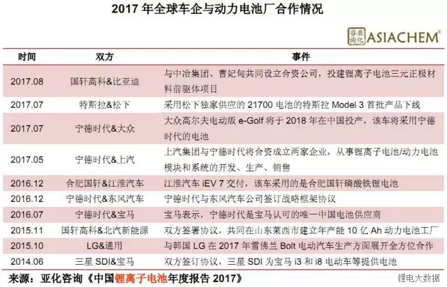 資料顯示,為了保證新能源汽車所使用動(dòng)力電池的技術(shù)匹配、供應(yīng)穩(wěn)定和價(jià)格合理,全球車企一方面加強(qiáng)了與動(dòng)力電池企業(yè)的合作,另一方面尤為重要的是,全球領(lǐng)軍車企紛紛選擇自建動(dòng)力電池工廠。2017年全球車企與動(dòng)力電池廠合作情況如下表所示。