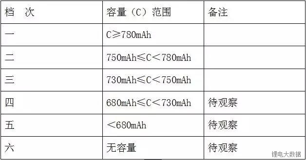 按如下檔次對電池進(jìn)行分容: