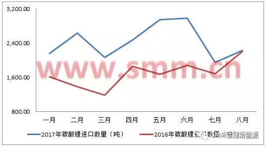 圖一:2016/2017年1-8月碳酸鋰進口數(shù)量趨勢圖(來源:海關(guān)信息網(wǎng),SMM)