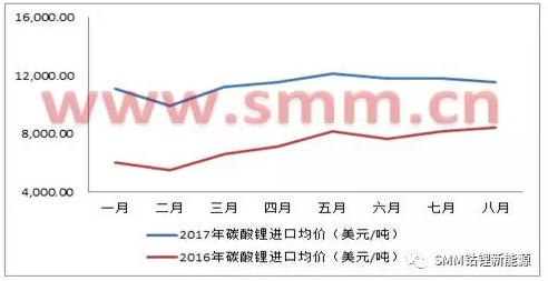 圖二:2016/2017年1-8月碳酸鋰進口均價趨勢圖(來源:海關(guān)信息網(wǎng),SMM)