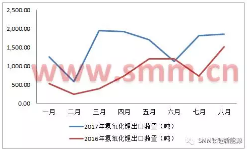 圖三:2016/2017年1-8月氫氧化鋰進口數(shù)量趨勢圖(來源:海關(guān)信息網(wǎng),SMM)
