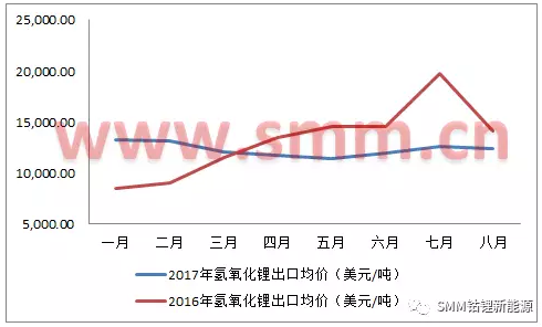 圖四:2016/2017年1-8月氫氧化鋰進口均價趨勢圖(來源:海關(guān)信息網(wǎng),SMM)
