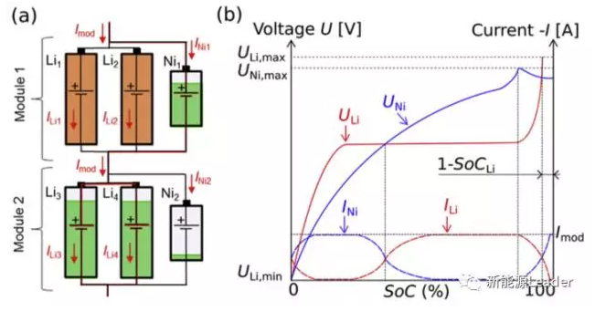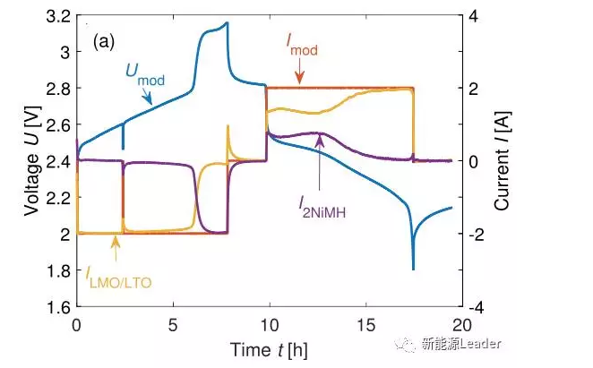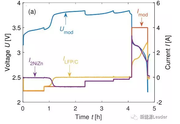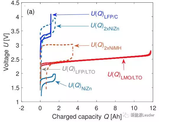 AlexanderU.Sch選取了LiFePO4和Li4Ti5O12材料作為實驗對象,原因是這兩種材料對過充都具有一定的耐受能力,并且在完全脫鋰后電壓會快速上升,此時NiMH和Ni-Zn電池承擔(dān)起電流Bypass的作用,多余的電流會流入到NiMH和Ni-Zn電池之中,從而避免鋰離子電池發(fā)生過充。