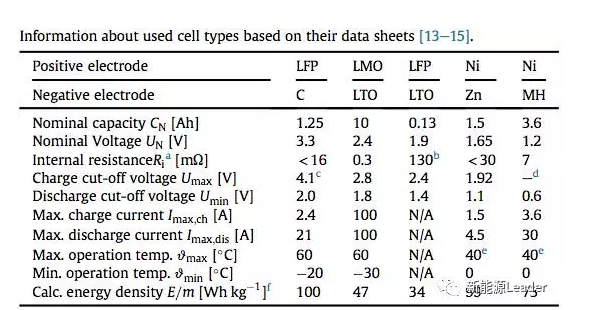 下表為實驗中使用到的電池的信息,實驗中主要用到了LFP/石墨,LMO/LTO,LFP/LTO,Ni-Zn和NiMH電池。