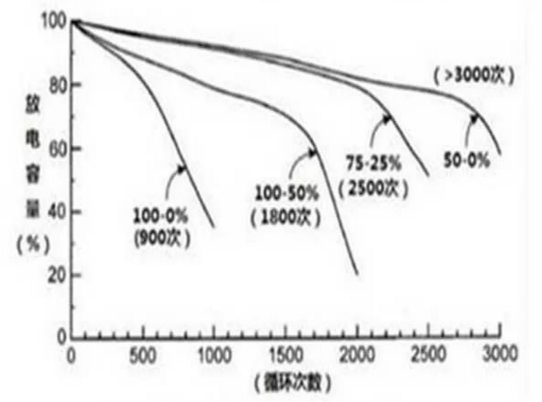 上圖為一三元鋰電池的充放電特性圖,可以看出,不同的充放電方式對電池的壽命影響不一樣,如上圖數(shù)據(jù),以25%-75%充放電的壽命可以達到2500次,即我們所說的電池淺充淺放。電池壽命這個話題我們以后還會深入討論。