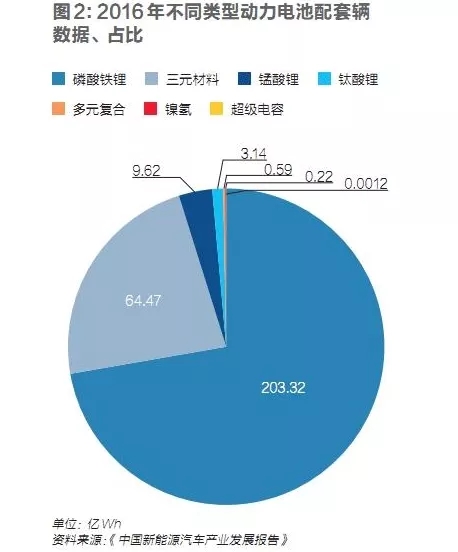 中國汽車技術(shù)研究中心的數(shù)據(jù)顯示,2016年中國生產(chǎn)的新能源汽車中,磷酸鐵鋰電池總配套量為203.32億Wh,占比72.26%,其中的72%供應(yīng)給純電動客車;三元電池總配套量為64.47億Wh,占比22.91%,其中的73%供應(yīng)給純電動乘用車。