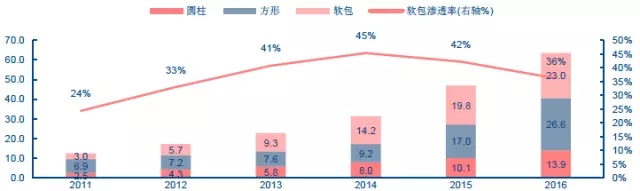 2011-2016年中國(guó)軟包、方形、圓柱鋰電池產(chǎn)量(GWh)及軟包電池滲透率