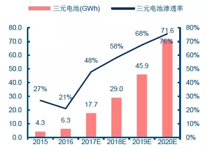 三元電池,尤其是高鎳三元電池成為動(dòng)力電池發(fā)展方向,至2020 年采用三元材料的動(dòng)力電池需求量有望上升至71.6GWh,占比由目前的22%上升至70%以上。但是,含鎳比例越高的三元材料,其穩(wěn)定性越差,導(dǎo)致電池安全性設(shè)計(jì)難度越大。目前,方形電池中磷酸鐵鋰較多,軟包電池中較多使用三元材料。