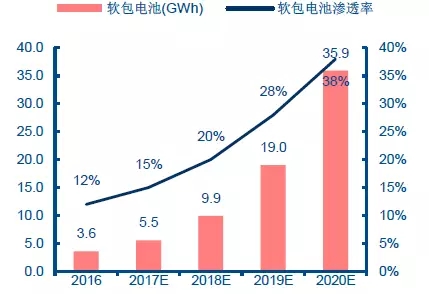 2016-2020年中國(guó)動(dòng)力軟包電池需求量及滲透率預(yù)測(cè)