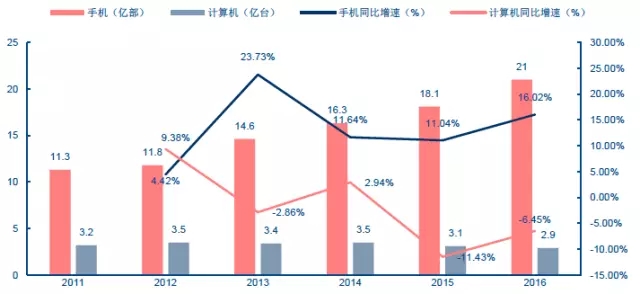 2011-2016年中國(guó)手機(jī)及微型計(jì)算機(jī)產(chǎn)量及同比增速