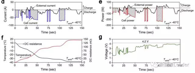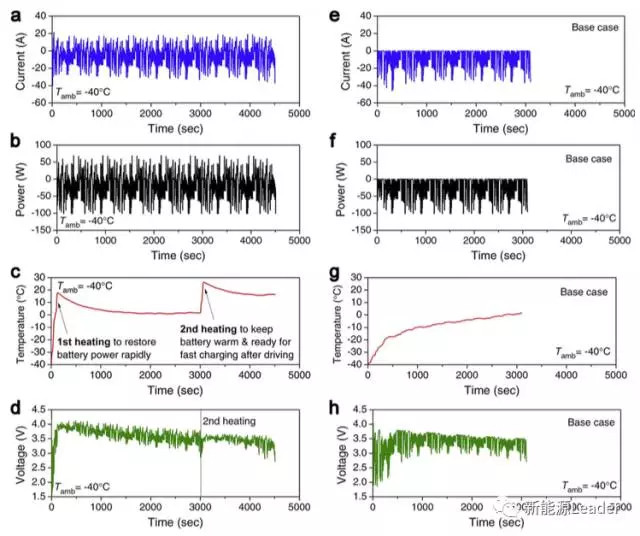下圖為使用自加熱電池和使用普通電池的對照組在-40℃下使用過程中的電流、功率、電池溫度和電池電壓等數(shù)據(jù)曲線,其中左邊為采用自加熱電池的實驗組,右邊為空白對照組。從電池溫度上看(圖c實驗組,圖g對照組),自加熱電池的溫度升高速度要遠遠快于對照組,實驗組緊緊用了112s就恢復到了20℃,并且實現(xiàn)了全部的剎車能量的回收,而對照組電池用了3000s,溫度才恢復到了0℃,從而導致無法回收剎車能量。