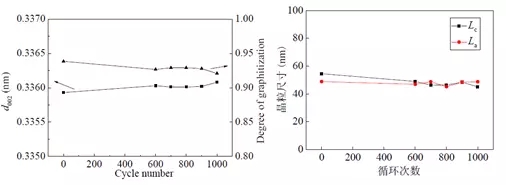 漸降低的趨勢(shì),La 沒有出現(xiàn)明顯的變化規(guī)律。其中Lc是d002 與晶粒內(nèi)石墨片層數(shù)的乘積,由此可以得到石墨片層數(shù)呈現(xiàn)減小的趨勢(shì),這樣的結(jié)構(gòu)變化宏觀上表現(xiàn)為石墨材料的脫落,最終導(dǎo)致鋰電池容量衰減。