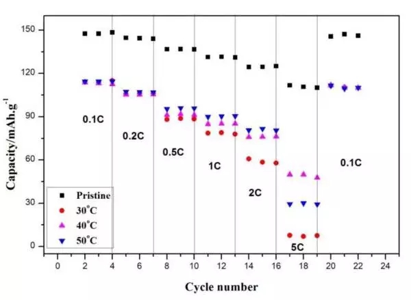 高溫條件下,三元材料各金屬元素的配比及電解液的性能對(duì)電池容量有重要影響。在少量循環(huán)次數(shù)之前,電池在高溫下放電容量要高于電池的額定容量和常溫下的容量(如下圖),這是由于高溫時(shí)電解液的黏度低,離子傳質(zhì)快,極片的反應(yīng)活性高,電池才表現(xiàn)出較高的充放電容量。但是隨著在高溫下循環(huán)次數(shù)增多,電池內(nèi)電解液會(huì)出現(xiàn)較快分解,在電極表面生成厚而不均的鈍化膜[4],電極材料結(jié)構(gòu)破壞,金屬離子溶出,導(dǎo)致容量衰減嚴(yán)重。