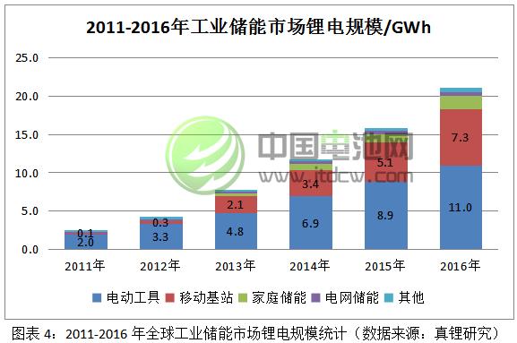 工業(yè)儲(chǔ)能市場(chǎng)的發(fā)展目前還主要依賴于電動(dòng)工具和移動(dòng)基站電源這兩個(gè)細(xì)分市場(chǎng)。圖表4顯示,電動(dòng)工具市場(chǎng)的占比2011年以來(lái)逐年下降:2011年電動(dòng)工具市場(chǎng)以2.0GWh占比83.2%,到2016年以11.0GWh占比52.0%。不過(guò),電動(dòng)工具市場(chǎng)鋰離子電池已基本完成了對(duì)鎳鎘電池等其他二次電池的替代,以后的市場(chǎng)增長(zhǎng)空間將非常有限。移動(dòng)基站電源市場(chǎng)2013年開始快速發(fā)展,到2016年以7.3GWh占比34.8%,這與中國(guó)電動(dòng)汽車市場(chǎng)的爆發(fā)基本同步,不少汽車電池次品在這個(gè)市場(chǎng)實(shí)現(xiàn)了應(yīng)用。