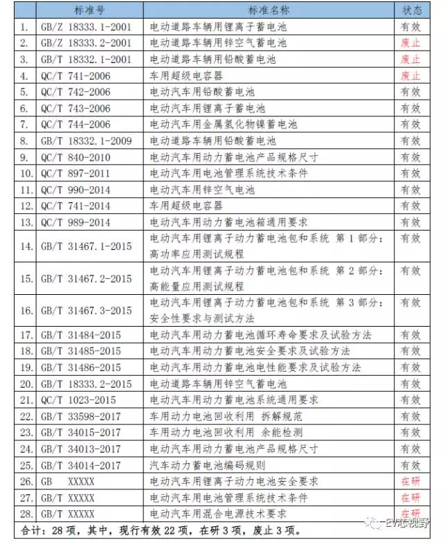 自1998年全國(guó)汽車標(biāo)準(zhǔn)化技術(shù)委員會(huì)成立電動(dòng)車輛分技術(shù)委員會(huì),完成動(dòng)力電池標(biāo)準(zhǔn)制定和在研的28項(xiàng)標(biāo)準(zhǔn),其中現(xiàn)行有效22項(xiàng),在研3項(xiàng),廢止3項(xiàng)。