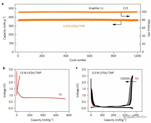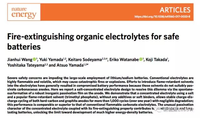 日本關(guān)于新型阻燃電解液的文章發(fā)表在著名期刊Natrue Energy上【2】,根據(jù)文章的簡(jiǎn)介來(lái)看,日本的科研人員是使用了高濃度的NaN(SO2F)2(NaFSA) or LiN(SO2F)2 (LiFSA)電解液,并向其中添加了常見的阻燃劑磷酸三甲酯TMP,這種高濃度電解液能夠在碳負(fù)極的表面形成一層無(wú)機(jī)鈍化層(SEI膜),能夠顯著的改善鋰離子電池的循環(huán)性能和熱穩(wěn)定性。最為重要的一點(diǎn)是,阻燃劑的加入并沒有降低鋰離子電池的電化學(xué)性能,采用該電解液的電池能夠穩(wěn)定的循環(huán)1000次以上,而沒有明顯的衰降,這就是這款電解液的厲害之處了。